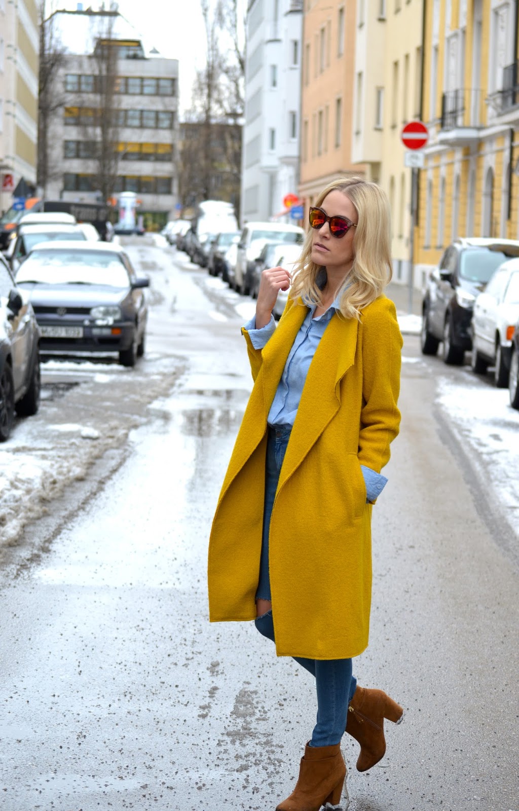 Der Mantel ist wirklich schön, ich dachte Blondinen steht dieser Senfton nicht, aber es sieht in der Kombination wirklich toll aus 🙂