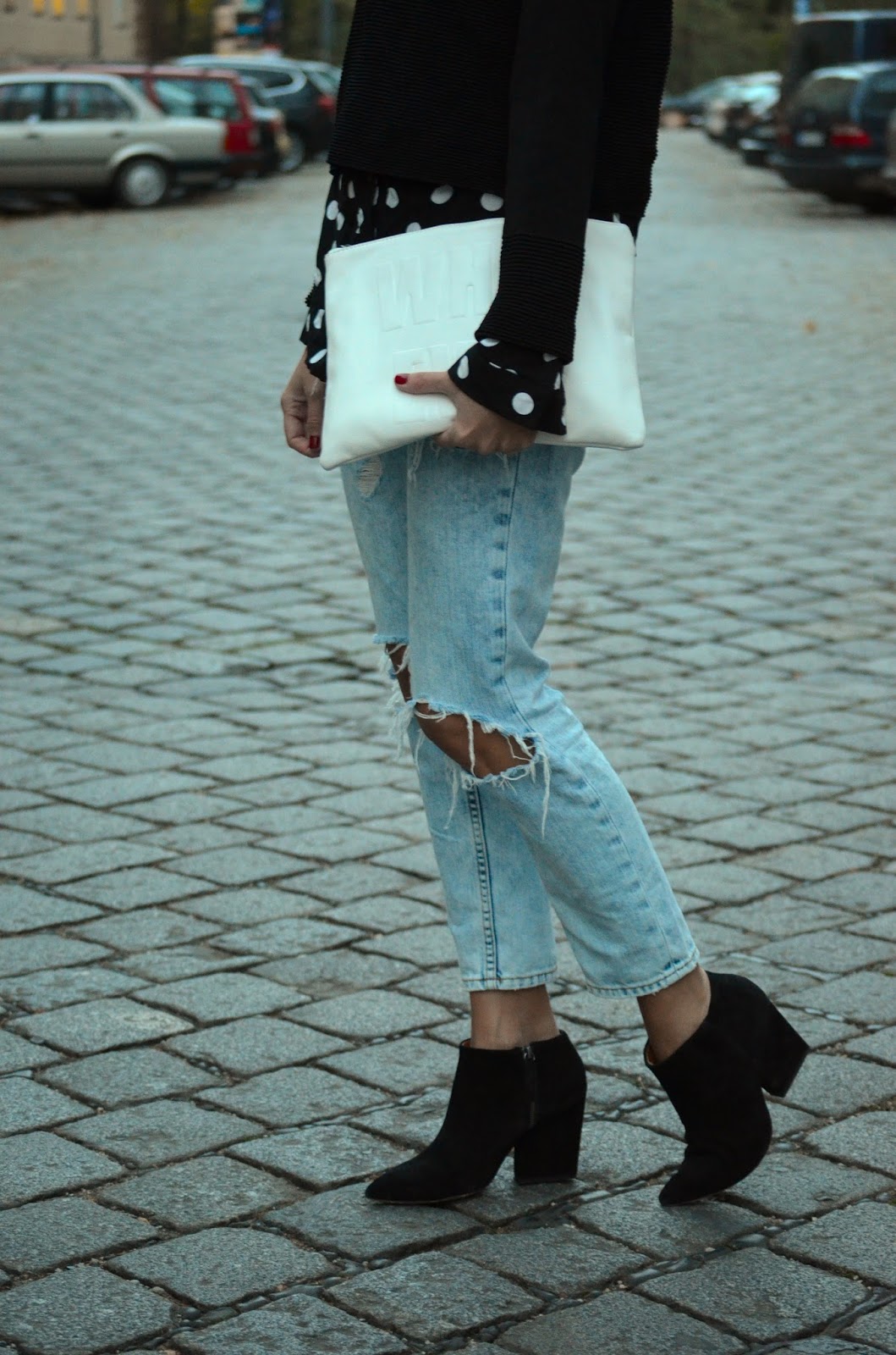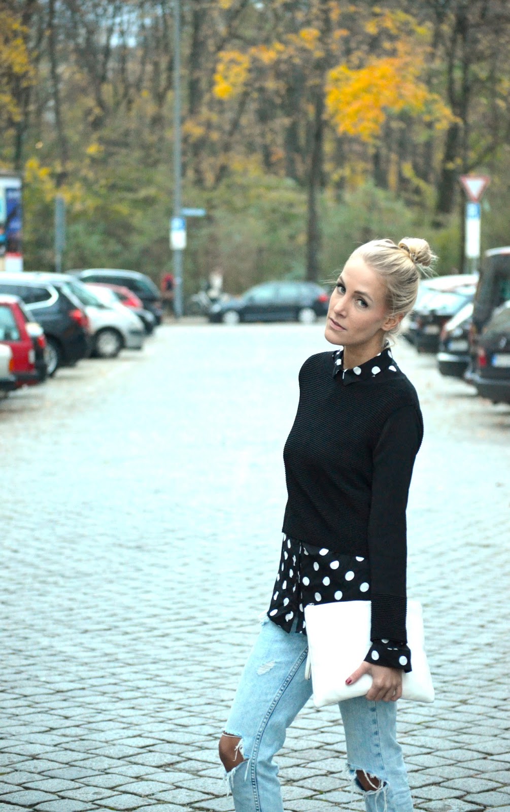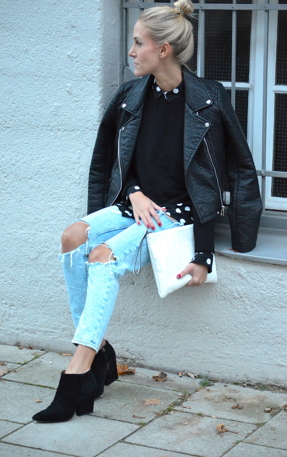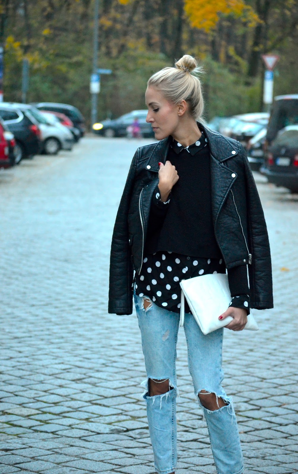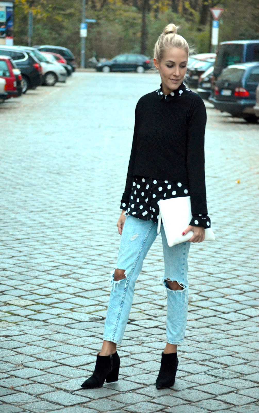 wow! ein so, so cooler look! so schlicht und basic, aber durch die gepunktete bluse und der zerrissenen jeans ist es einfach ein absoluter hingucker. echt soo super, aber das sind sowieso alle outfits von dir/euch 🙂